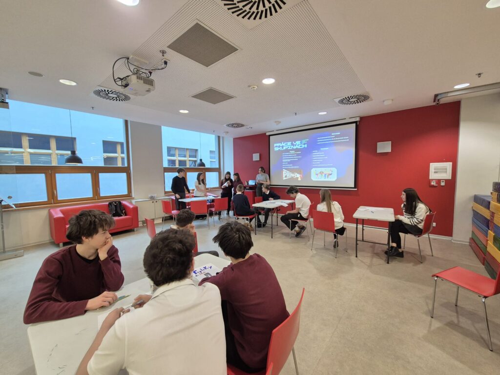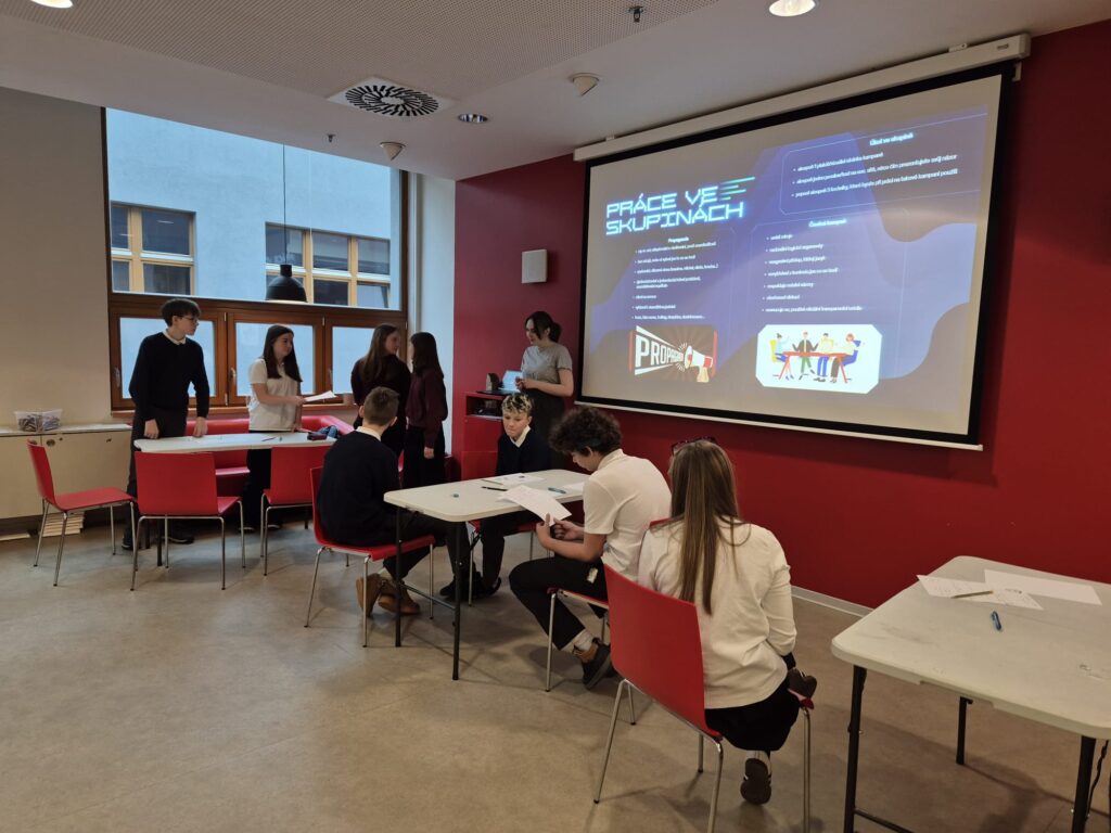 Součástí programu byl také malý workshop – studenti si sami zkusili připravit 📝 krátké texty, a to jak reklamní sdělení, seriózní informativní texty, tak i ukázky propagandy. Díky tomu si mohli prakticky vyzkoušet různé způsoby práce s informacemi a jejich vliv na čtenáře.
