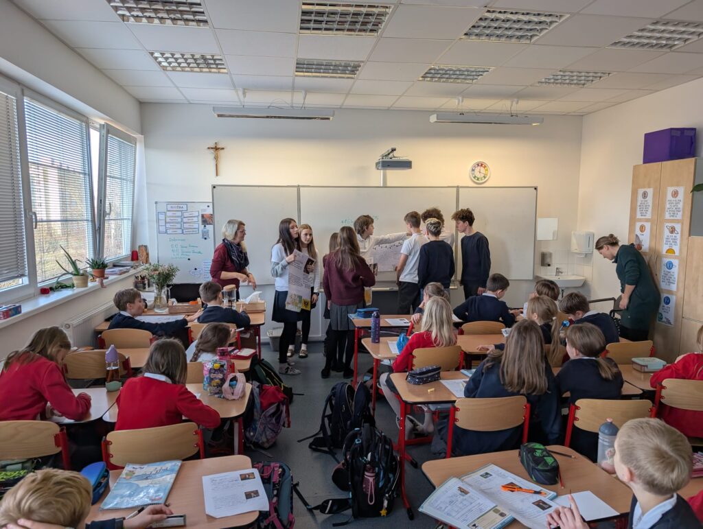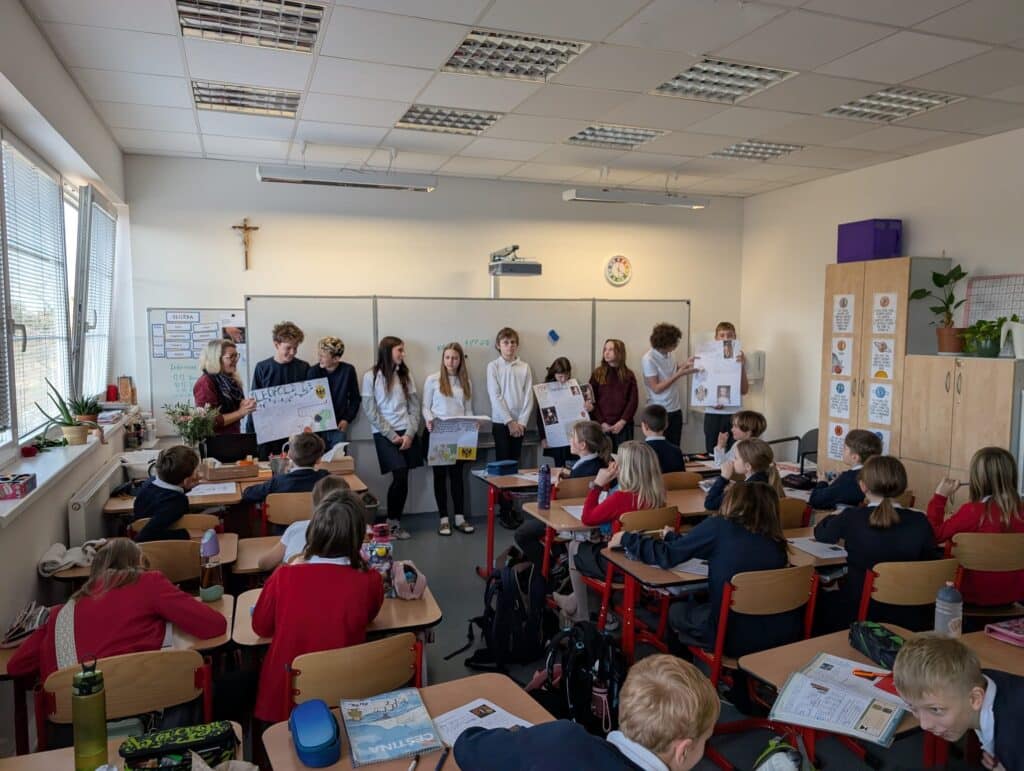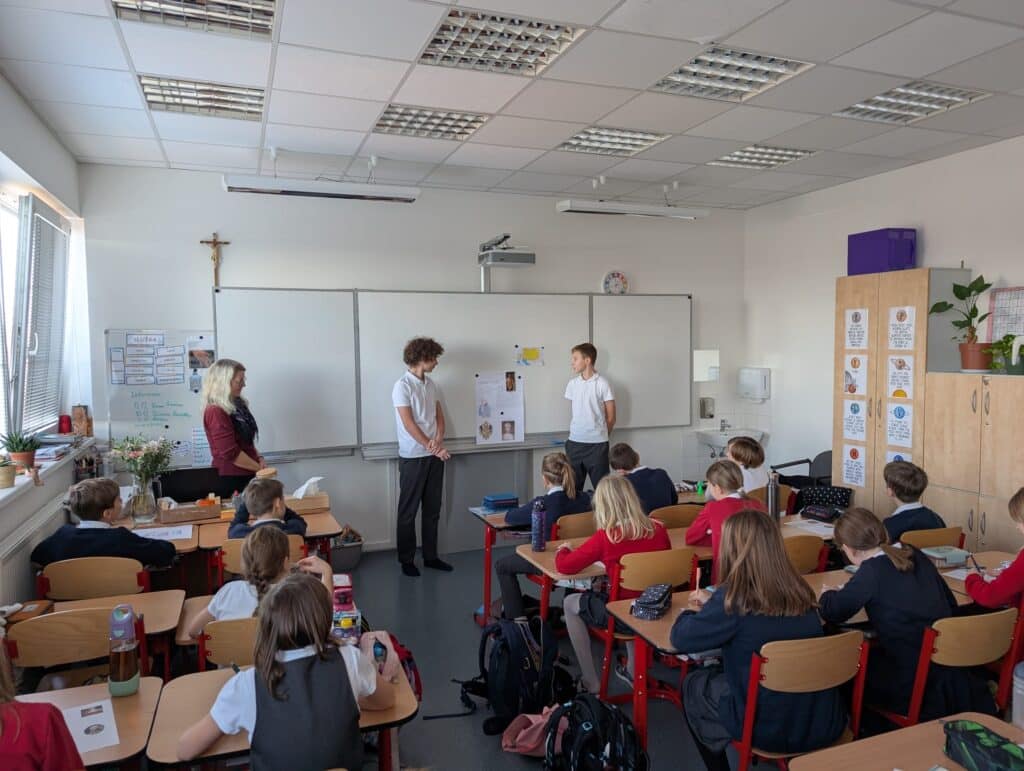 👩🏫 👨🏫 Osmáci výsledky svého projektu představili svým mladším spolužákům z 5. třídy, kteří měli možnost aktivně se ptát, diskutovat a zapojit se do výuky formou peer-learningu — tedy učení mezi vrstevníky a blízkými věkovými skupinami.