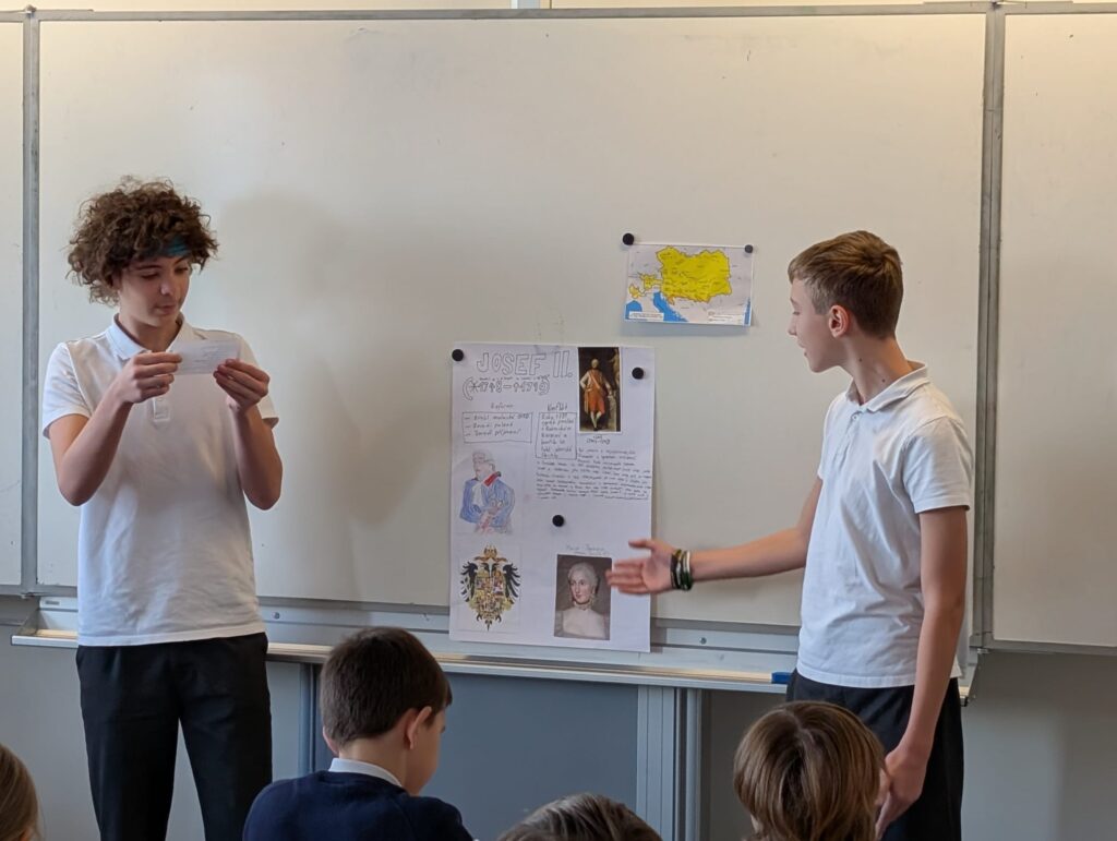 V hodině 📚 dějepisu žáci 8. třídy připravili týmové projekty věnované významným panovníkům habsburské monarchie v období baroka a osvícenství. Jejich práce zahrnovala studium zdrojů, tvorbu vlastních posterů a přípravu krátkých prezentací.