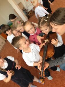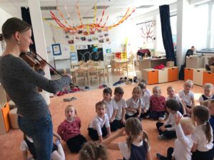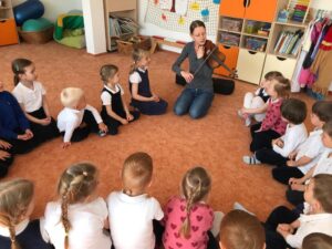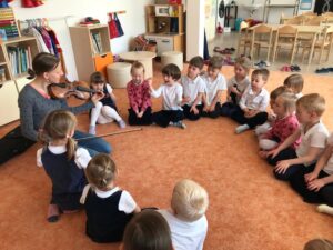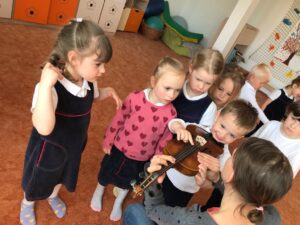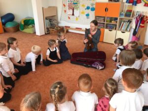 Dnes jsme měli ve školce hudební dopoledne. Vyzkoušeli jsme si, jaké to je být dirigentem orchestru, seznámili jsme se s houslemi a poslechli si krásné houslové skladby, zazpívali si písničky, a dokonce jsme si na housličky mohli sami zahrát. Děkujeme za milou návštěvu naší bývalé paní učitelce, která hraje v orchestru!