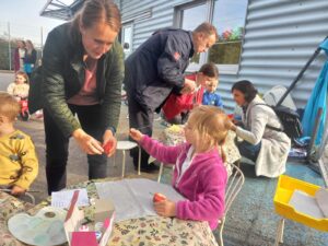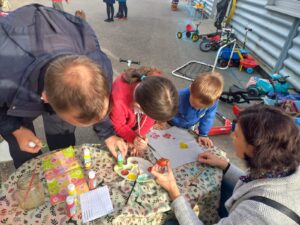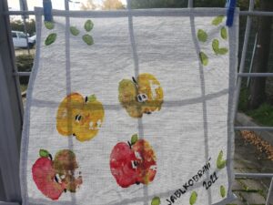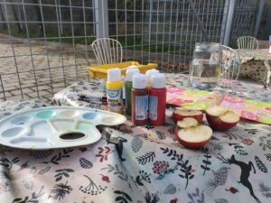 Děti i rodiče si mohli zahrát ovocno-zeleninové pexeso, obtiskávat jablka, odpovídat v našem kvízu (bez používání Googlu 😉) … Když splnili všechny úkoly, čekala na ně jablečná odměna.