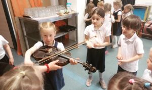 Děti si po veselém představení mohly vyzkoušet zahrát na saxofon, flétnu, housle a buben.